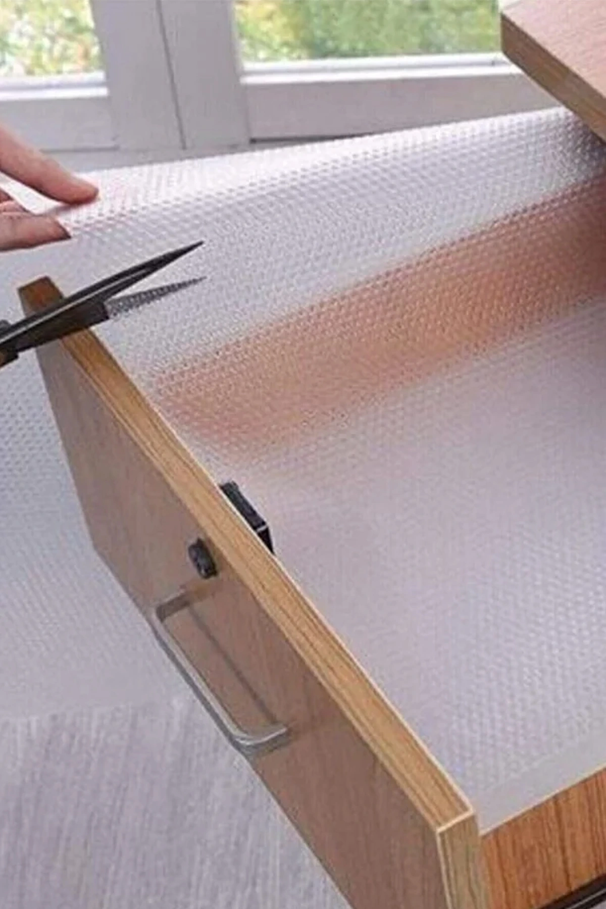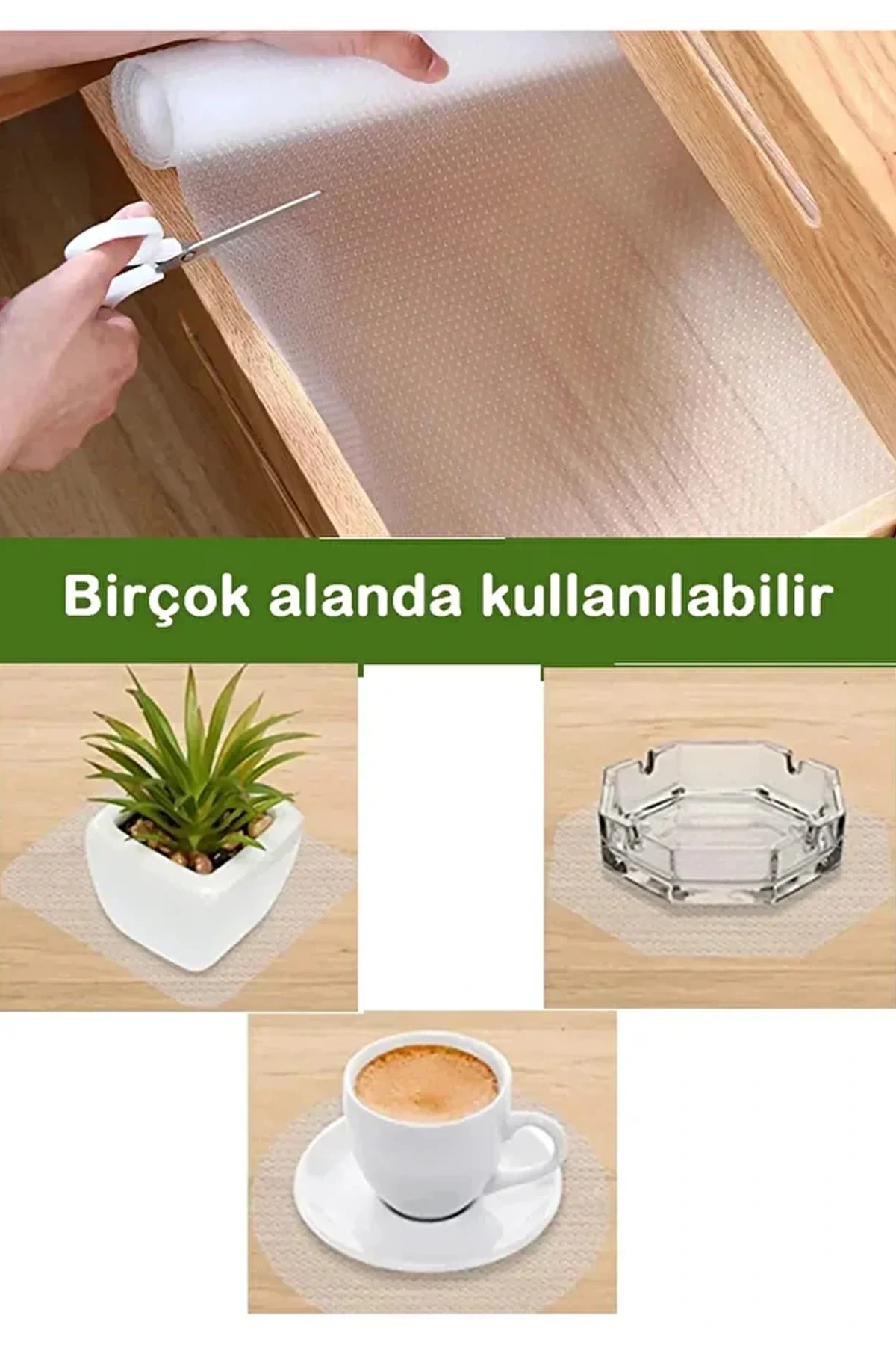 Uzunluk: 5 METRE, GENİŞLİK: 45 CM ; RENK: RENKSİZ/ŞEFFAF ; ÜRÜNÜMÜZ KAYMAZ TABANLIDIR.; LEKE TUTMAZ.; YIKANABİLİR YADA SİLİNEBİLİR.; TEMİZLEMESİ OLDUKÇA KOLAYDIR.; DOLAP RAFLARI, AYAKKABILIK,BUZDOLABI VE ÇEKMECE İÇLERİNE KULLANABİLİRSİNİZ.; 45 cm x 5 metre dir.; Uzunömürlü yıkanabilir kaydırmaz %100 eva malzemeden üretilmiştir. Her türlü çekmece raf dolap ve tezgah üstü yüzeylerde rahatlıkla kullanılabilir, yıkanabilir temizlenebilir leke tutmaz istenilen şekil ve ebatta kesim yapabilirsiniz. Antibakteriyel özelliği ile gıda temasına uygun üründür bu yüzden buzdolabında en çok tercih edilen ürün çeşididir.